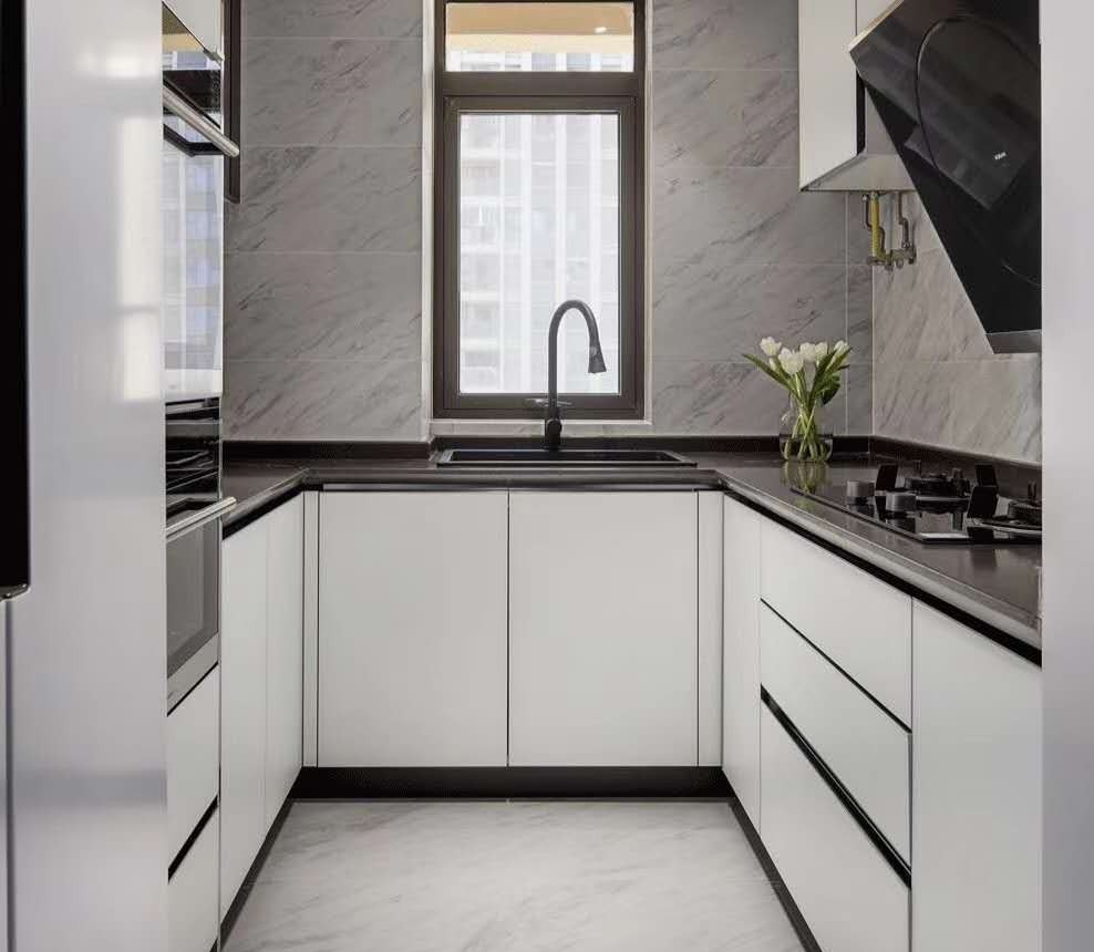4、選擇合適的顏色:在選擇U型廚房的顏色時,也要考慮到其重要性。可以選擇一些明亮的顏色,例如白色和灰色,來增加空間感和采光。同時,可以在墻面、櫥柜和地面上選擇不同的顏色和材料進行搭配,以創造出更加令人舒適的視覺效果。