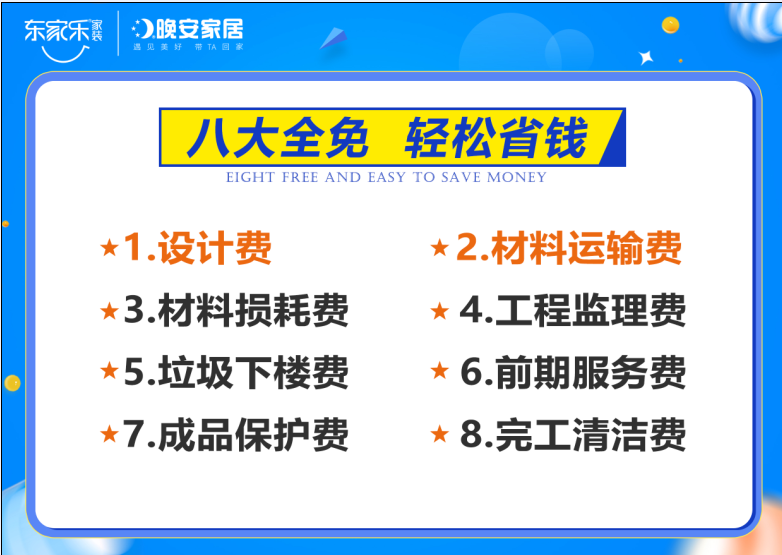綜合管理費(fèi)(造價(jià)10%),垃圾清運(yùn)費(fèi),完工清潔費(fèi)等八大全免,輕松省錢(qián)。