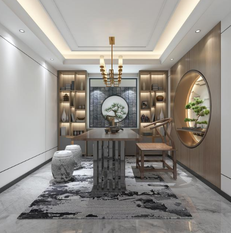 在簡(jiǎn)約的基礎(chǔ)上添加了一些中式的元素,不管是會(huì)友還是自酌都十分的有意境。沏一壺茶,煮一杯酒,這樣的生活真令人向往。