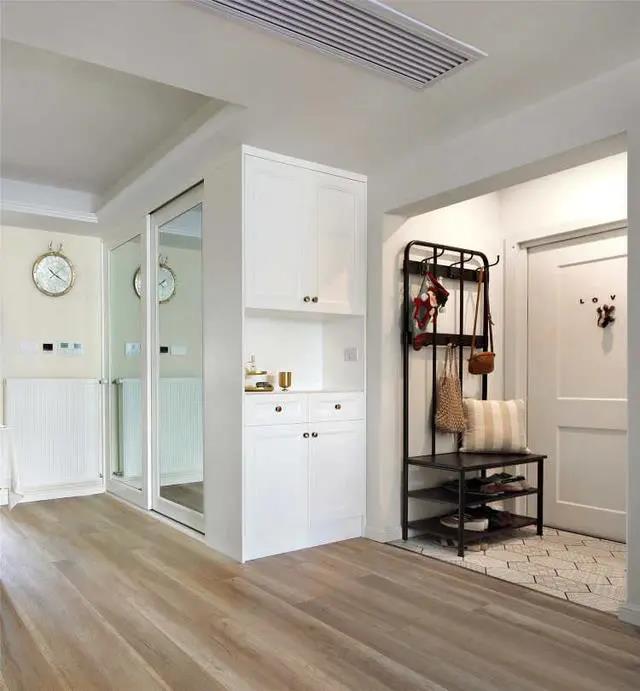 入戶借用1m公共空間,做成獨(dú)立小玄關(guān)。地面鋪貼六邊形花磚,防滑耐臟而且顏值也不差。成品鞋帽架搭配穿衣鏡,讓小小的玄關(guān)空間提升實(shí)用性。將餐廳多余空間改成儲(chǔ)物間,1.98*0.95規(guī)格,收納能力還是不錯(cuò)的。借用儲(chǔ)物間一面設(shè)計(jì)鞋柜,滿足玄關(guān)對(duì)鞋的收納。