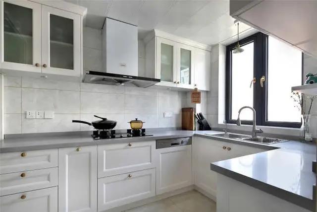 廚房使用淺色的瓷磚、白色的櫥柜門,搭配金屬色的圓形門把手,平添了幾分精致時(shí)尚。u型廚房設(shè)計(jì),不僅拓寬了臺(tái)面空間,還提高了廚房整體收納。原來(lái)1㎡的北陽(yáng)臺(tái)被改造成了廚房電器區(qū),冰箱,烤箱,蒸箱,熱水器全布置在里面,空間整潔又實(shí)用。
