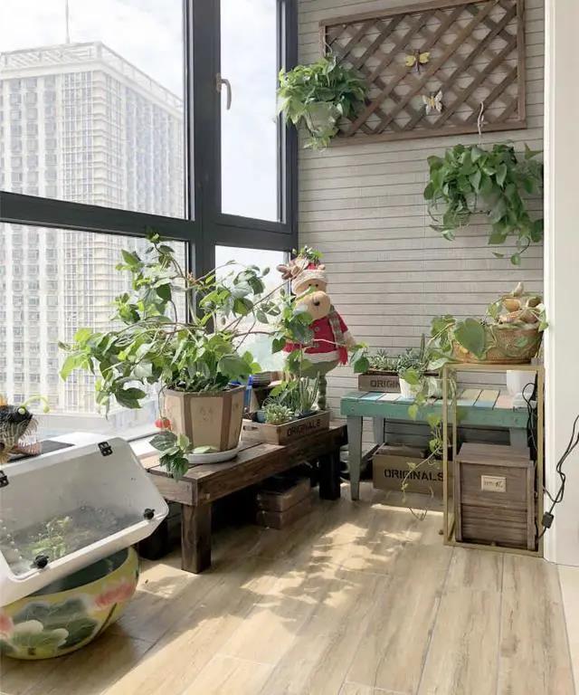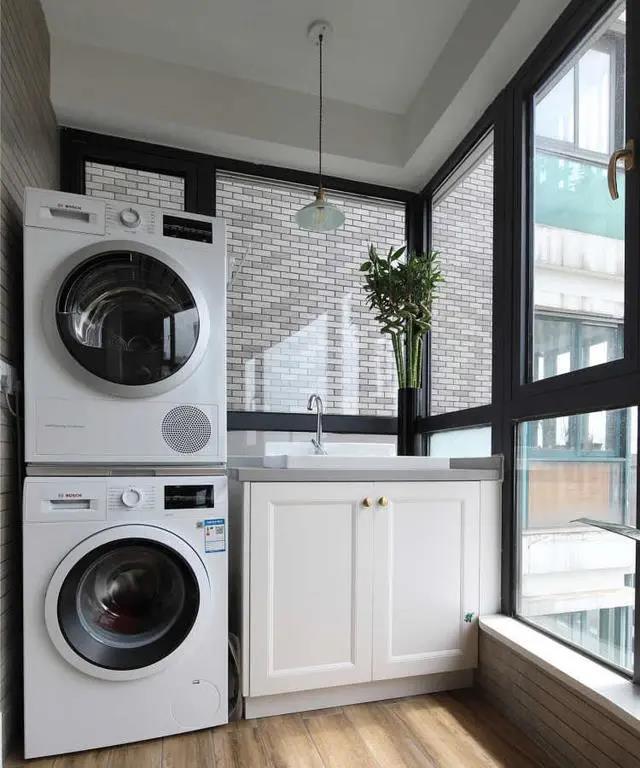 陽(yáng)臺(tái)布局實(shí)用有情調(diào),一側(cè)布置成洗衣區(qū),洗衣機(jī)、干衣機(jī)、洗衣柜搭配小吊燈。另一側(cè),復(fù)古風(fēng)的家具和花花草草,完全陶冶生活的小天地。