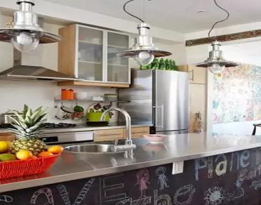 能夠自然隨意彎曲的別致吊燈已經足夠成為這間廚房的亮點,而在下方櫥柜背后還有大塊面的黑板設計也足夠讓人過目不忘。這樣的廚房一定是為了家中有調皮寶貝的家庭所設計,忙于烹飪的主婦們在烹飪的同時,也許會無暇顧及到一旁好動的寶貝,那么就可以讓小朋友在這面黑板前用心作畫吧。