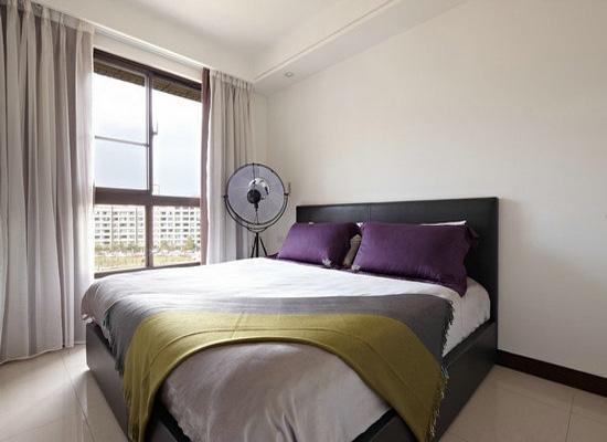 臥房是屬于私人的領地,大家可以根據自己的需要和喜歡來進行布置。圖中這款臥房的布置非常的簡單,白色的墻面搭配白色的地板,顯得很亮堂。臥房內家具很少,黑色的實木床上鋪著銀灰色的床單,紫色的抱枕,顯得很雅致。