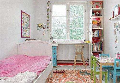 這是一個孩子的臥房,為了給孩子騰出更多的活動空間,主人選用了體積較小的單人床,為了方便孩子玩耍,主人還在地上鋪著精美的黃色的地毯。臥床對面擺著小桌子和小凳子,孩子們可以在這里一起搭積木、玩玩具。窗臺的位置則打造成了雅致的學習區。
