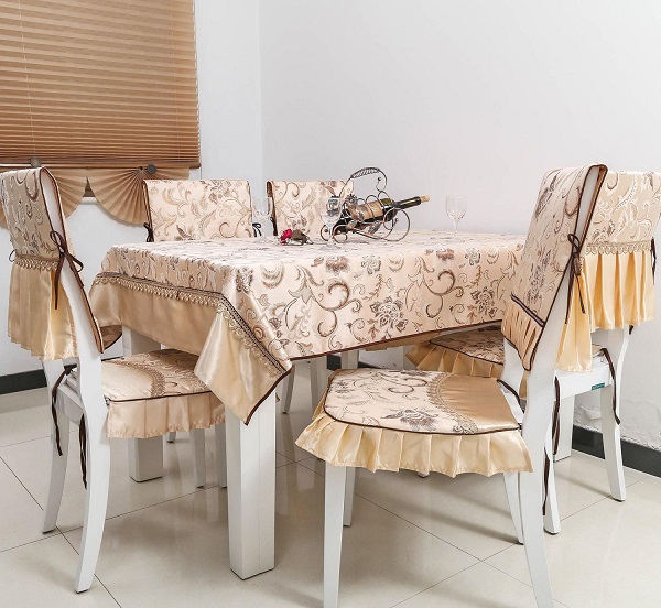 綢緞面料做成的餐桌椅套,一般是中式風格,給人感覺是高貴典雅、大方亮麗,摸起來也是十分細膩,手感很好,當然相對應的價格也不低。圖案一般是提花,非常精致。而且不能用洗衣機洗,只能手洗。一般喜歡深色復古家具的親們可以考慮看看,真的是很高大上呢。